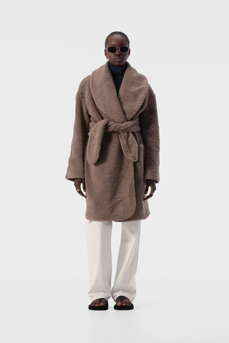 The Erla Coat in Taupe is designed for ultimate comfort when dressing this season. A soft teddy fabric for maximum warmth, this coat features an oversized lapel, full length sleeve, dropped shoulder, and tie belt closure. Falling to mid-thigh length, this coat is accentuated by the curved hem and hip pockets. Layer over office suiting for a low-key work look, or pair with staple denim for easy daywear styling.