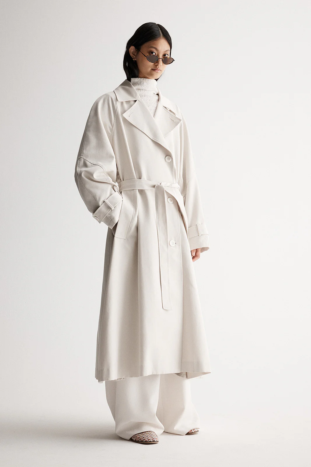Timeless pieces born of the need for versatility and longevity are embodied in the arrival of the Leonora Trench. A wardrobe staple for transitional outfitting, this trench coat is cut to an oversized fit and full length with classic revere collar, button front and tie belt. Distinguished by its subtle detailing, this trench features a raglan sleeve with elbow seam detail.