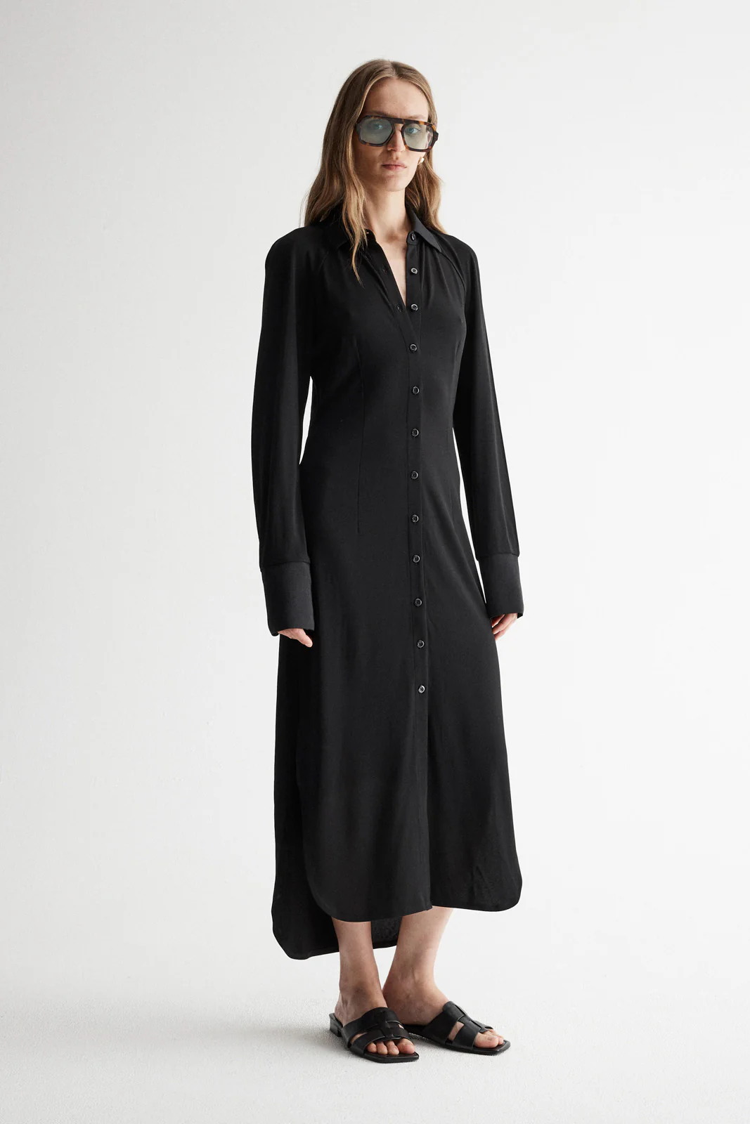 Leaning into new contemporary styling, the Loretta Dress is an evolution of our day to night essentials. Made of a luxuriously soft and stretchy jersey fabric, the Loretta Dress has a slinky texture that drapes elegantly over the body. Cut to a lightly relaxed silhouette, the Loretta Dress has a classic collared neckline and button through front with full length sleeves and contrast ribbed texture detailing. The split hi-low hem gives this dress a semi-casual look for an effortless work to weekend outfit.